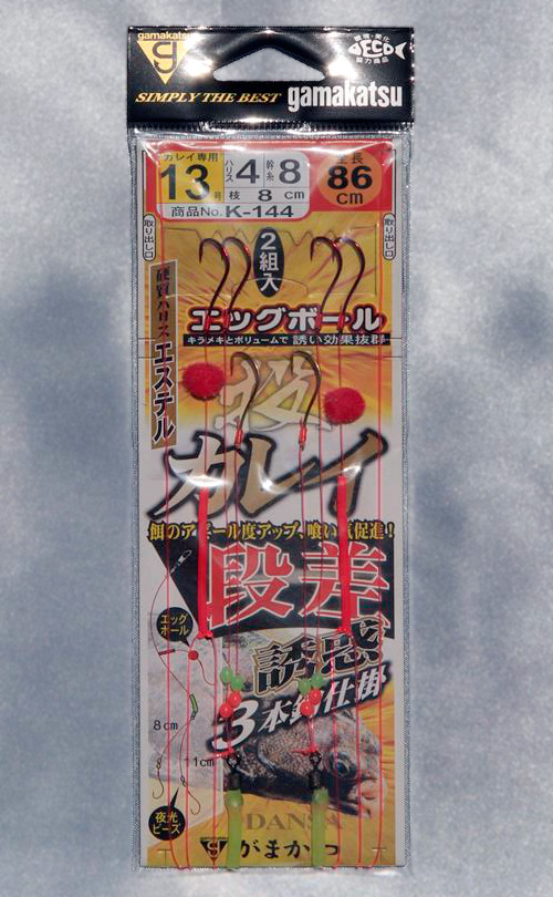 欠点はほとんどのカレイ仕掛けが2本バリなのに対して、ハリが3本付いており、エダスにはエッグボールが装飾されるなど、ちょっとコストのかかる仕様となっているため他の仕掛けに比べてちょっぴりお高くなっています。そのせいか量販店などでは置いているお店が少ないようです。ラインナップは11〜14号までの4種類。